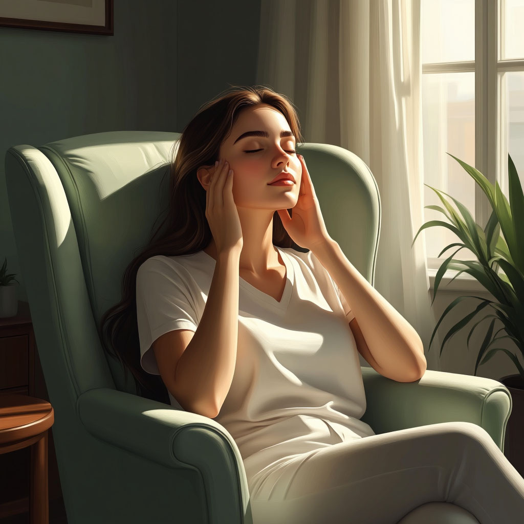 · Расслабление челюсти: Положите подушечки пальцев на мышцы челюсти (внизу, возле ушей) и совершайте небольшие круговые движения, одновременно позволяя челюсти расслабиться и слегка отвиснуть.