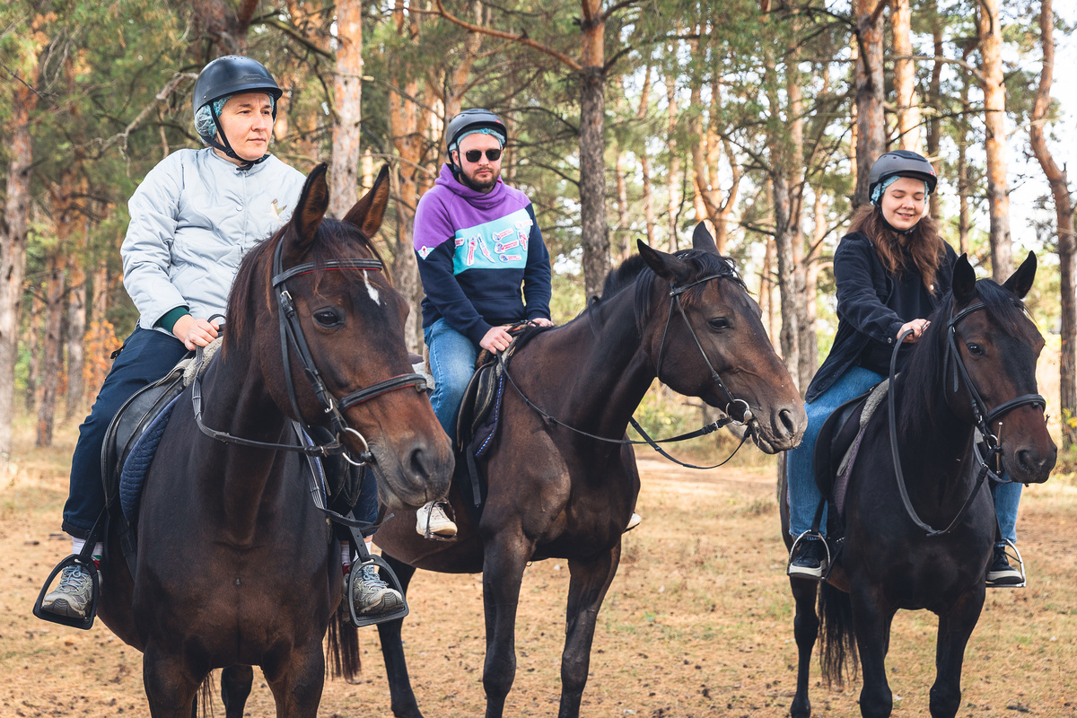 Конные прогулки — это не только спорт, но и отдых для души. Осенью они особенно атмосферные: вокруг золотой лес, под ногами шуршит листва, а рядом — величественная лошадь.