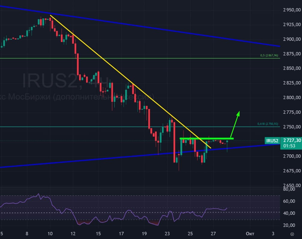 🏦 Индекс Мосбиржи 🏠 ПРОЕКТ ФЕДЕРАЛЬНОГО БЮДЖЕТА НА 2026Г И ПЛАНОВЫЙ ПЕРИОД 2027-2028ГГ ВНЕСЕН В ГОСДУМУ - ПРЕСС-СЛУЖБА ПРАВИТЕЛЬСТВА 🟢 Итак, на рынке у нас каша. но график технически за рост. 🟢 2700 - поддержка, которую не смогли пробить на максимальной апатии рынка и негативных новостях, сломлен желтый нисходящий тренд, формируется поджатие к зеленой горизонтальной линии. 🟢 Если пробьем зеленую линию, то выход вверх будет на высоту накопления. 👍 Среднесрочно цели конечно же выше, но пока что на рынке скукота. #индекс #рубль #индексмосбиржи #ММВБ #IRUS #MXI #MIX #IMOEXF #bogdanoffinvest