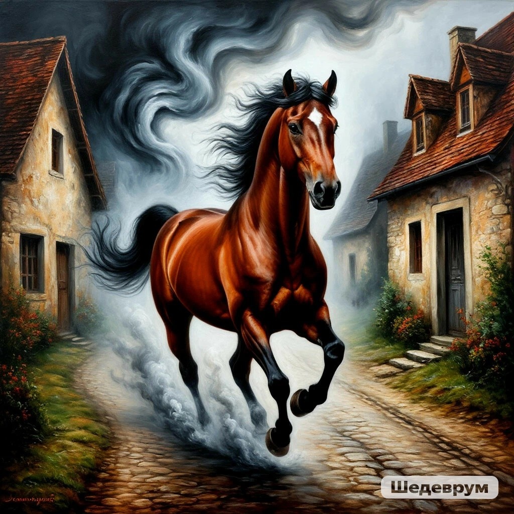 Из-за поворота показался гнедой конь. Каким же он был красавцем! Масть – словно закатное солнце, отблескивающее в полированной бронзе. Густая грива волнами развевалась на бегу. Ноги – сильные, пружинистые. Копыта отбивали четкий ритм по асфальту.