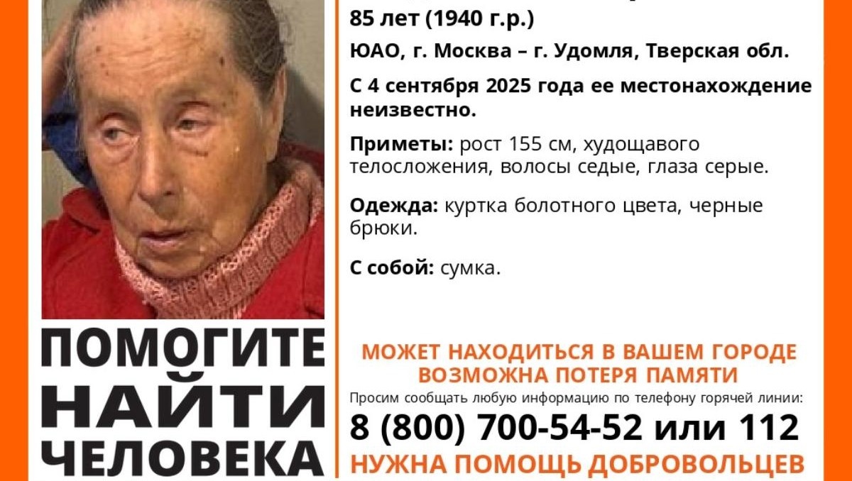 Волонтеры поискового отряда "ЛизаАлерт" сообщили, что в Тверской области может находиться 85-летняя Людмила Игнатьева. С 4 сентября 2025 года ее местонахождение остается неизвестным. Информацию о пропавшей женщине просят сообщать по указанным в ориентировке контактам волонтеров. Читайте также на ТИА: в Тверской области женщина вспомнила старые обиды и подожгла дачу соседки. Мы в МАХ: присоединяйтесь!