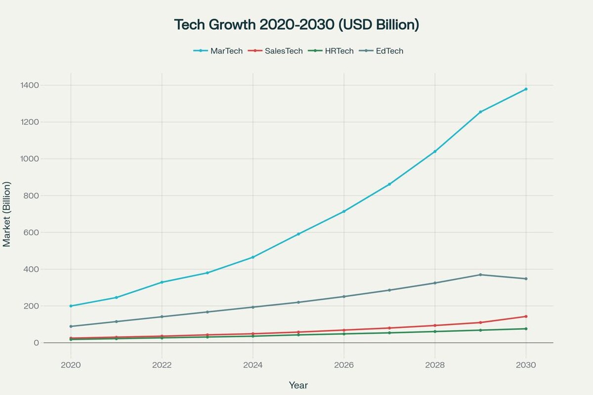 А вы насколько доверяете данным из Perplexity? Рост четырех Tech-индустрий с 2020 по 2030 год в миллиардах долларов США и Индекс относительного роста MarTech, SalesTech, HRTech и EdTech индустрий в России с 2020 по 2030 год (более точных данных не нашлось) Интересно что по РФ выводит так: MarTech: 20% SalesTech: 17% HRTech: 28% EdTech: 30% Хотя где-то слышал, что HRTech около 40% растёт 🤔