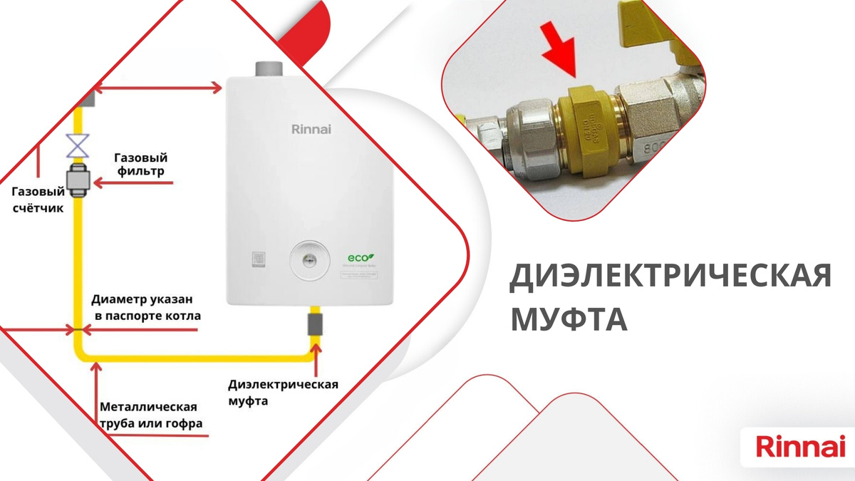 Уважаемые владельцы котлов Rinnai! Мы всегда заботимся о вашем комфорте и безопасности. 🏡 Чтобы ваше оборудование служило долго и надежно, мы хотим рассказать о важном, но простом шаге — установке диэлектрической муфты. Представьте, что по вашей газовой трубе неожиданно начинает проходить небольшой электрический ток. Это и есть «блуждающий» ток — невидимый, но нежелательный гость. Откуда он берется? Чем это опасно? Такой ток — это серьезный риск: Специальная диэлектрическая муфта действует как барьер для тока. Она не мешает газу поступать к котлу, но надежно останавливает любые блуждающие токи. Это как «буфер безопасности» для вашей техники. Где ее установить? Муфта ставится прямо перед котлом, между запорным краном на трубе и гибкой подводкой! ⚠️ ВАЖНО! Дорогие друзья! Если вы хоть немного сомневаетесь в своих силах, пожалуйста, не рискуйте! Установку муфты лучше доверить проверенному газовому специалисту! Ваша безопасность — это главное! 2. Аккуратное отсоединение 🔧 3. Устанавлива
