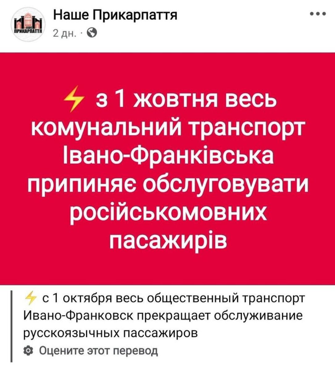 С 1 октября в Ивано-Франковске, Украина, вводится запрет на обслуживание русскоязычных граждан в общественном транспорте.