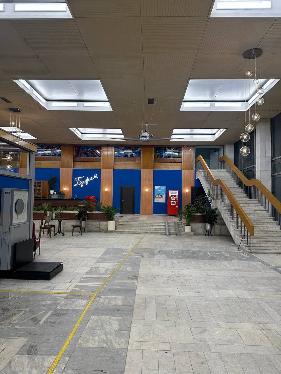 Вологда. Интерьеры здания аэропорта. Уютный старый аэропорт отреставрировали для приёма туристов. Приятный ремонт, старые советские панно. Фразы из известных советских шлягеров. Словом, дружелюбная домашняя обстановка. Очень хорошо для маленького аэропорта. Из деталей: Здание на ночь закрывается, для утреннего рейса в 8 мы приехали в 6-30 и полчаса ждали открытия аэропорта. Разумеется, со всеми остальными пассажирами нашего рейса. 📱 Архитекстура #Вологда