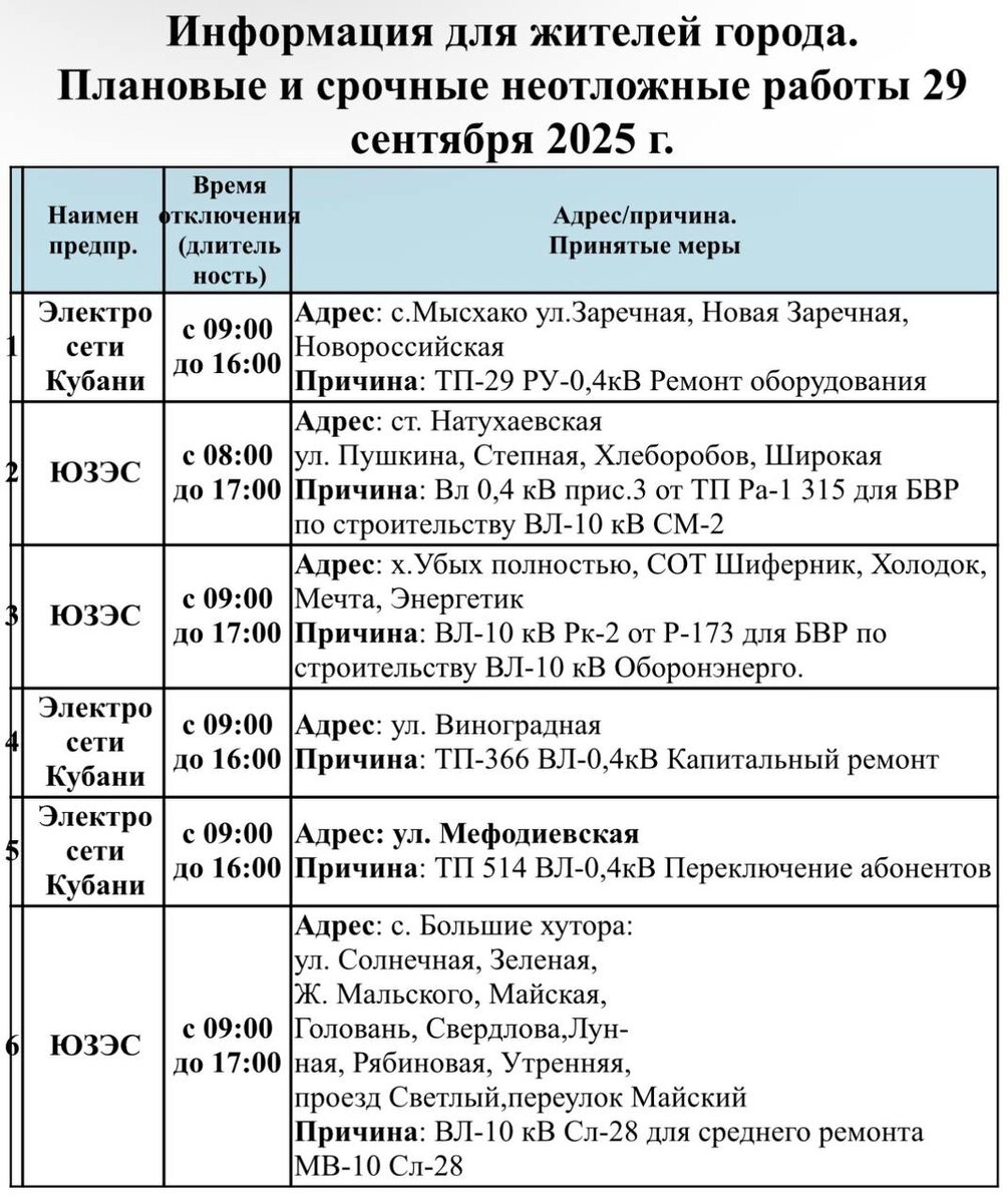 ‼️ Плановые отключения на 29.09.2025г. 🤩 Подписаться | БОТ ННН