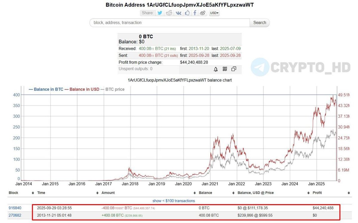 🤔 «Проснулся» древний холдер BTC из 2013 года – перевел 400,07 BTC ($44,24m) на 27 новых адресов.