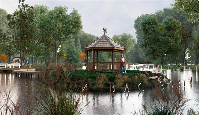 Гостей, попавших в парк с улицы Октябрьской, по традиции, заведенной еще в царской России, будет встречать верстовой столб. Далее прогулка продолжится по оживленному Совхозно-Фабричному тракту, набережные которого оформлены эко- настилами для досуга у воды, легкими павильонами в духе местного деревянного зодчества для уличной торговли, сезонного фуд-корта, мини-ремесленных мастерских.