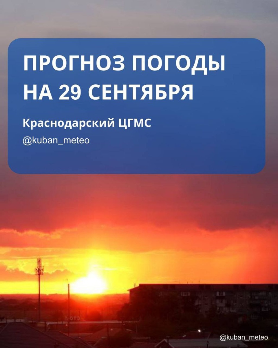 ☁️⛅⛈️ 🌦 Понедельник, 29 сентября 📍 Краснодарский край Облачно с прояснениями. Ночью без существенных осадков, днём местами дождь, в отдельных районах сильный дождь. 🌫 Ночью и утром местами туман. 💨 Ветер восточный: ночью 4–9 м/с, днём 6–11 м/с, местами порывы 12–14 м/с, днём в отдельных районах 15–18 м/с. 🌡 Температура воздуха: ночью 5…10°, на Азовском побережье 8…13°; днём 14…19°. 🌄 В горах: ночью 0…+5°, днём 3…8°. 🏖 Черноморское побережье Облачно с прояснениями. Утром и днём временами дождь, местами сильный с грозой. 💨 Ветер восточной четверти 6–11 м/с, местами порывы 12–14 м/с. 🌡 Температура воздуха: ночью 10…15°, днём 16…21°. 🔥 В центральных (включая МО г. Краснодар), северо-восточных и юго-западных районах Краснодарского края ожидается высокая пожароопасность (ВПО) 4 класса (НЯ). 📍 По г. Краснодару Облачно с прояснениями. Ночью без осадков, днём дождь, временами сильный. 💨 Ветер восточный: ночью 4–9 м/с, днём 6–11 м/с, порывы 12–14 м/с. 🌡 Температура воздуха: ночь