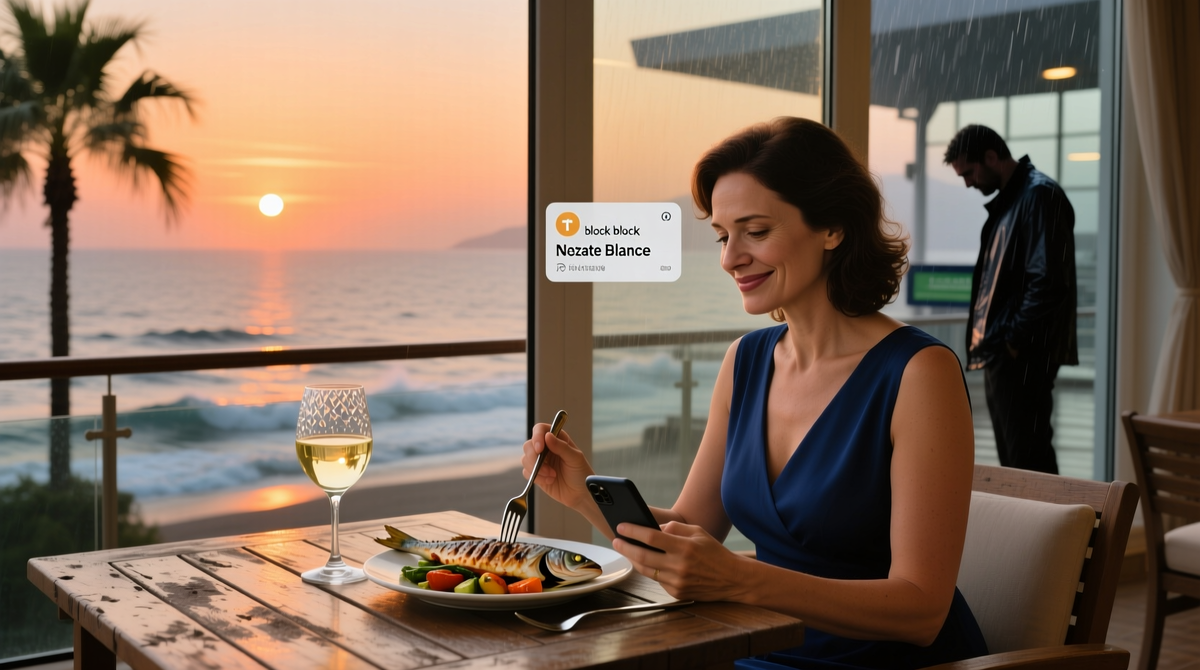 Открыла камеру. Сфотографировала вид с террасы – море, закатное небо, бокал на столе. Отправила ему.