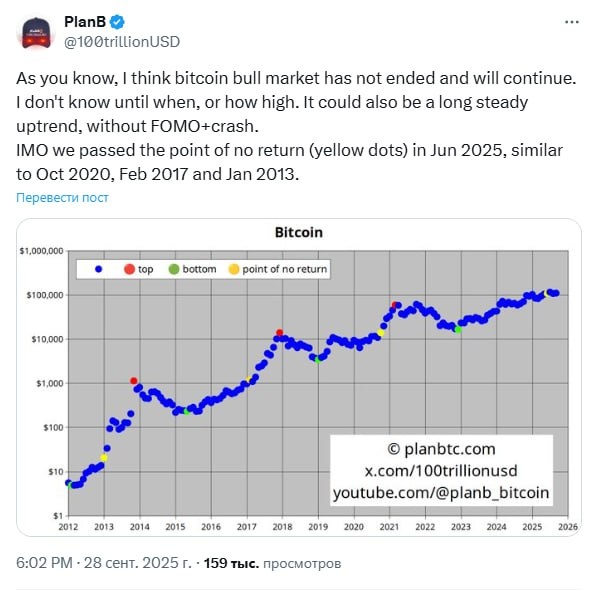 Как вы знаете, я считаю, что бычий рынок биткоина еще не закончился и продолжится. Я не могу сказать, до каких пор или насколько высоко он вырастет. Это также может быть длительный устойчивый восходящий тренд без этапов ажиотажного спроса (FOMO) и последующего обвала. По моему мнению, мы прошли точку невозврата (желтые точки) в июне 2025 года, аналогично октябрю 2020, февралю 2017 и январю 2013 года.