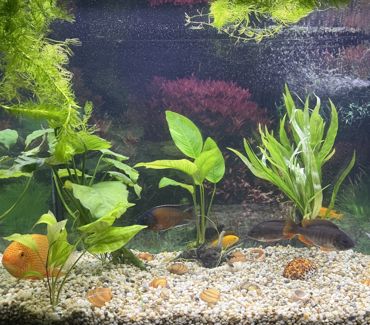 Ещё до покупки рыбок я думала, что уж в 125 литров я запущу не меньше 10-15 штук. Вообще это реально, можно и 20-25, но при условии, что это будут мелкие рыбешки 4-5 см длиной. Я же мечтала видеть в своём аквариуме 10-15-сантиметровых рыбок. Среди аквариумистов ходит такая формула расчёта: на 1 см рыбы нужно 1 литр воды. Но эта формула работает только для мелких рыб до 6 см длиной. Посадить в 10-литровый аквариум 10-сантиметровую цихлазому будет полнейшим издевательством над ней, она там будет себя чувствовать как преступник в карцере. Поэтому для средних и крупных рыб такая формула не актуальна. Тогда сколько же можно? Перелопатила я кучу статей и форумов и поняла, что однозначного ответа на этот вопрос нет. Нужно учитывать кучу факторов: мощность фильтрации и аэрации, характер самих водных обитателей, так как многие из них территориальны и им нужен собственный угол (комната) в подводной квартире. Плюс при заселении аквариума нужно исходить их размера рыб во взрослом состоян