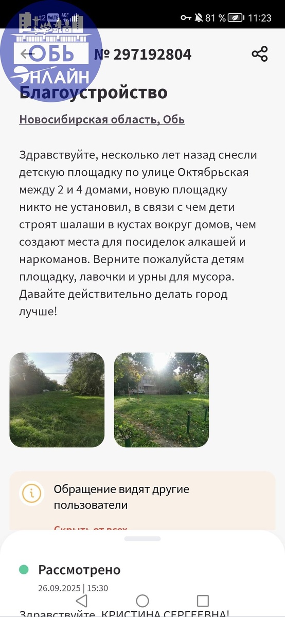↗ Интересно получается, как снести площадку, никого спрашивать не нужно, собственников квартир собирать тоже не обязательно, да и новую взамен устанавливать тоже никто не обязан. А если вы хотите чтобы площадка была собирайте собрание, подписи и тогда может быть, но не точно. УК Ленинская, хочу вам напомнить что площадка требующая покраски не может являться ветхой, ее установили примерно в 2010 году. У нас много советских площадок, которые действительно требуют демонтаж и которыми никто не интересуется vk.ru Подробнее на https://vk.com/ob.gorod #городобь #городобьонлайн #толмачево