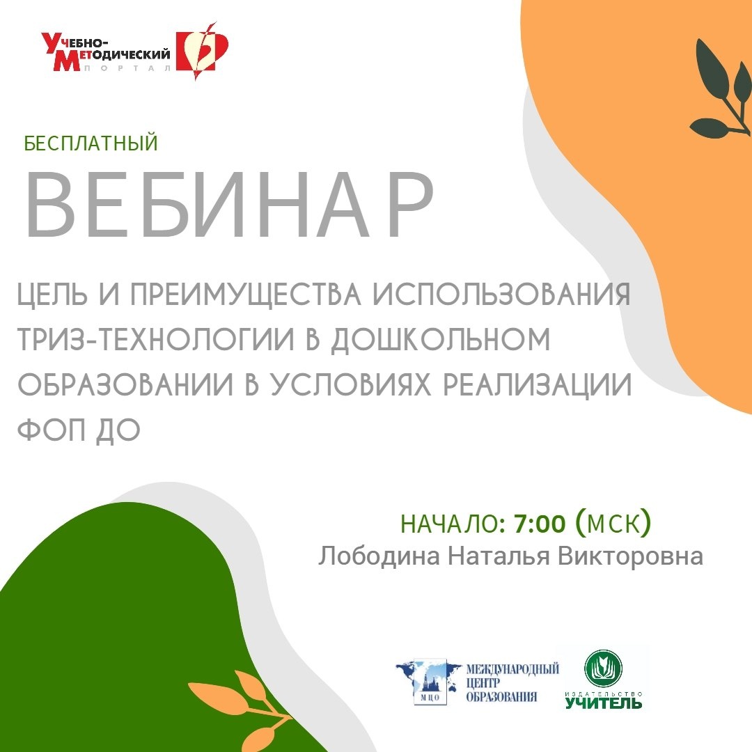 Международный вебинар «Цель и преимущества использования ТРИЗ-технологии в дошкольном образовании в условиях реализации ФОП ДО» Дата проведения: 30.09.2025 Начало: 7:00 (МСК) https://www.uchmet.ru/events/item/3907539/ На вебинаре слушатели вместе с ведущим рассмотрят цель и преимущества использования ТРИЗ-технологии в дошкольном образовании в условиях реализации ФОП ДО. На вебинаре будут рассмотрены следующие ВОПРОСЫ: - Технология ТРИЗ – технология развития творчества. - Методы ТРИЗ, их характеристика. - Актуальность использования технологии ТРИЗ. - Цель и задачи использования технологии ТРИЗ. - Этапы работы по использованию элементов ТРИЗ на занятиях в детских творческих объединениях. - Приёмы для активизации воображения и создания творческой среды. - Приёмы фантазирования. Ведущий вебинара: Лободина Наталья Викторовна, учитель начальных классов высшей квалификационной категории, старший методист Муниципального общеобразовательного учреждения "Средняя школа №103 Советского района