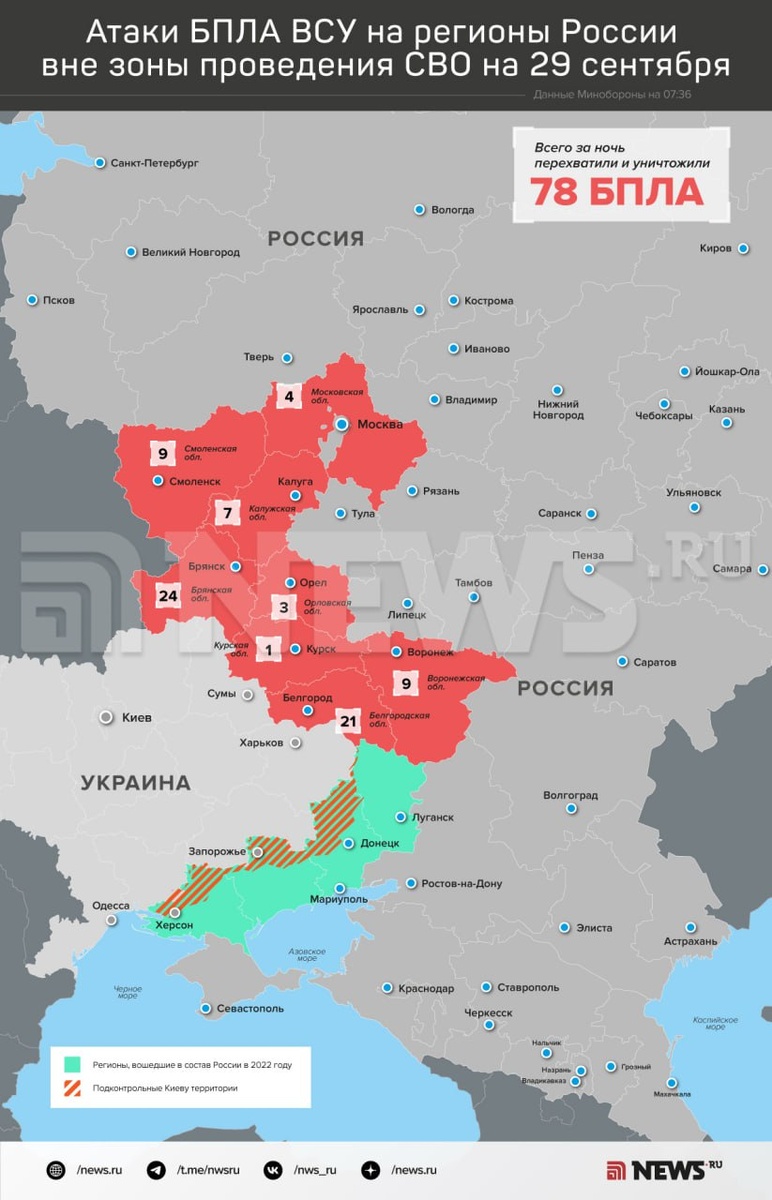 78 украинских БПЛА сбили силы ПВО над регионами России с 23:00 мск до 07:00, передает Минобороны. 24 уничтожили над Брянской областью, 21 — над Белгородской, по девять — над Воронежской и Смоленской, семь — над Калужской. Четыре дрона сбили над Московским регионом, три — над Орловской областью, еще один — над Курской. Всего в ночное время перехвачено 84 БПЛА ВСУ, отметили в ведомстве. ⭕️ Подписаться | Мы в MAX | Буст