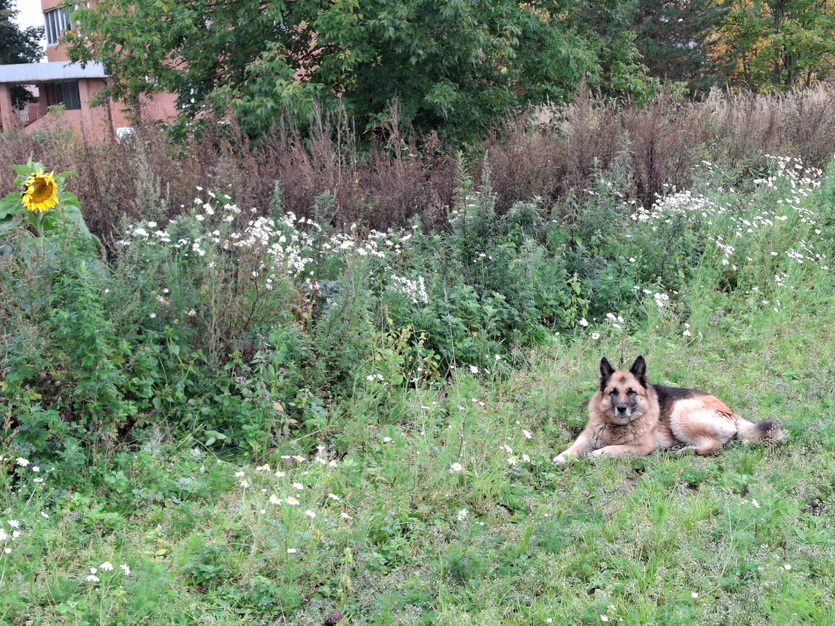 Собака Кира к дождю относится спокойно, главное - не жарко. На краю поля вырос подсолнух. Красивый... Может, весной на клумбе посадить? :))) Палочку нельзя подобрать, ее надо отломить! :) В лесу хорошо даже в дождь. Собака Кира не ищет легких путей :) Мокрая собака. Но шуба у нее непромокаемая :) "Отоспитесь на природе" :) Нет, лучше дома :) Темнеет рано. Вечером гуляли с собакой Кирой. Встретили ежика на газоне. У нашего дома тоже как-то ежика видели, но там было совсем темно, без фонарей. Собака Кира ежиками не интересуется, понюхала и легла. А кошка Тома спит дома. Она гулять не ходит :)