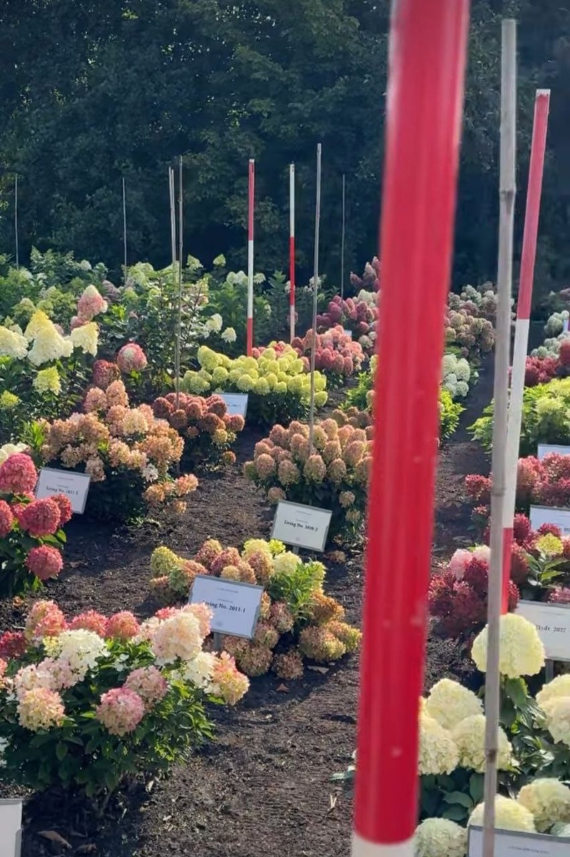 А вот так выглядят поля, где делается отбор растений. Данные кусты со слов селекционера растут с 2015-2017 годов. Это далеко не быстрый процесс. Из 3000 семян остаётся только несколько десятков тех экземпляров, за которыми начинают наблюдение. А красные палки рядом, это те сорта, которые возможно будут зарегистрированны. Перед каждым сортом стоит табличка с присвоенным номером. Соответственно любой сорт имеет свой номер. Затем этот сорт регистрирую и он выходит в свет. P. S. Тенденция идёт на низкорослые сорта, Заметили?