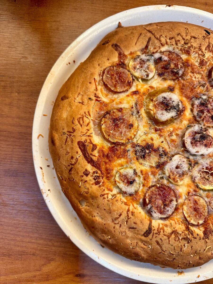 Открытый пирог с инжиром и сулугуни. Друзья! У нас сезон инжира. Вкуснейший пирог (можете и пиццей обозвать) Ингредиенты (диаметр 34 см) Тесто: 1️⃣ Мука пшеничная - 300 гр плюс 2 ст.л 2️⃣ Сахар - 1 ст.л 3️⃣ Ряженка 2,5% - 100 мл 4️⃣ Вода - 200 мл 5️⃣ Дрожжи растворимые - 6 гр 6️⃣ Соль - 1 ч.л без горки 7️⃣ Растительное масло - 2 ст.л Начинка: 1️⃣ Сыр сулугуни - 150 гр 2️⃣ Сыр с голубой плесенью - 30 гр 3️⃣ Ивёрдый сыр - 30 гр 4️⃣ Орегано сухой - 2 ч.л без горки 5️⃣ Розмарин - 1 ч.л без горки 6️⃣ Инжир 5-6 шт. Приготовление: 1. С вечера приготовьте тесто. Сделайте опару, соединив Сахар, 2 ст.л муки, дрожжи и 100 мл тёплой ряженки. Поставьте в тёплое место на 15-20 минут, до появления пузырей. 2. В опару добавьте 300 гр муки, соль, растительное масло и воду. Замесите липкое не слишком густое тесто. Месить нужно достаточно долго, пока оно не станет блестящим и гладким. 3. Положите тесто под плёнку в холодильник на 6 часов. Оно увеличится в объёме в 2-3 раза. 4. Достаньте, обомните. 5.