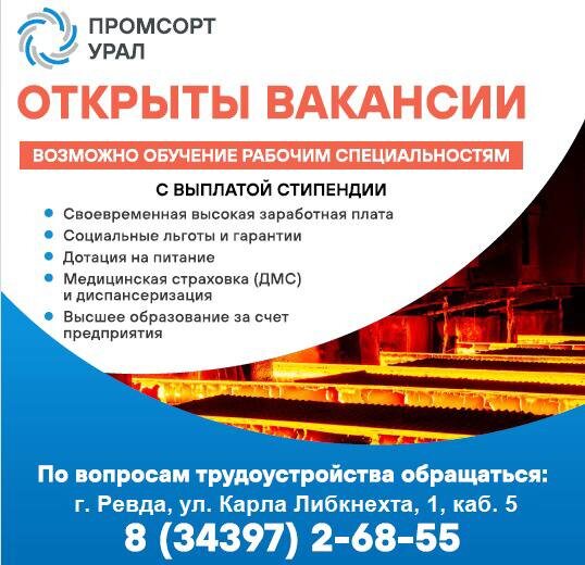 АО "ПромСорт-Урал" г. Берёзовский 📌МАШИНИСТ КРАНА МЕТАЛЛУРГИЧЕСКОГО ПРОИЗВОДСТВА (ученик) 📌ПРИЕМОСДАТЧИК ГРУЗА И БАГАЖА 📌УБОРЩИК ГОРЯЧЕГО МЕТАЛЛА (ученик) 📌ОПЕРАТОР ПОСТА УПРАВЛЕНИЯ (ученик) 📌ЭЛЕКТРОМОНТЕР ОПЕРАТИВНО-ВЫЕЗДНОЙ БРИГАДЫ Своевременная выплата заработной платы; Доставка корпоративным транспортом; Добровольное медицинское страхование; Обучение профессии за счет предприятия. ☎️8(982)750-04-43 pershina_md@promsort.ru