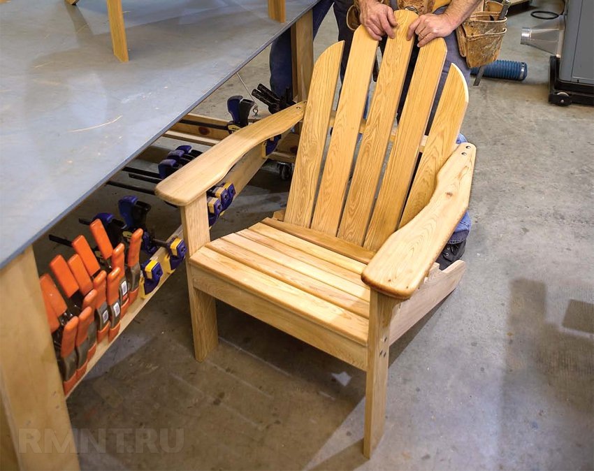 Основа адирондака — деревянный щит, сбитый из двух поставленных на ребро широких досок, по верху которых набиты тонкие деревянные рейки. За счет изогнутой формы ребер дощечки ложатся по определяемому вами изгибу сиденья. В передней части щита сиденье образует традиционное закругление, чтобы последняя планка скрепляла щит в поперечной плоскости. В задней части щита ребра выступают на длину от трети до половины сиденья и выполняют роль задних ножек.