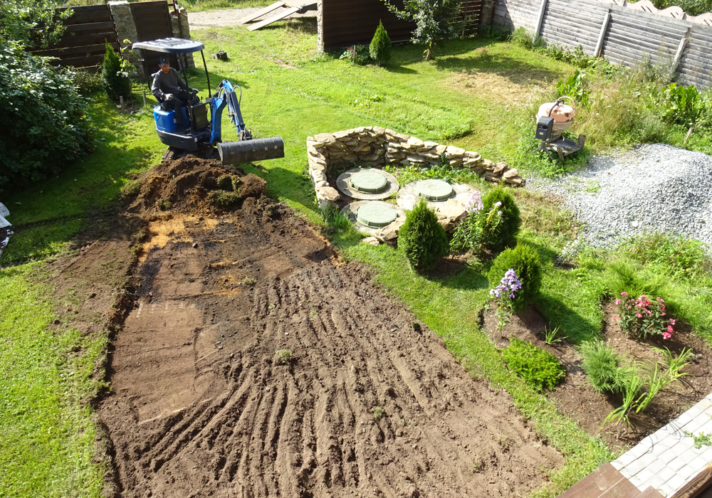 Эх, почему бы было не начать на пару неделек раньше, чтобы не спеша, чтобы в охоточку. Или вообще не начинать и оставить на следующий год. А всё она, Главный Архитектор. Взяла и вызвала трактор, а тот разворотил весь двор, вдоль и поперёк. Не пройти не проехать. И отступать уже некуда. Воленс-ноленс, бери в руки лопату и приводи в порядок. Насколько я припоминаю, последнее, что показывал — щебень. Два КАМАЗа, разнесённых и размазанных по поверхности, а затем тщательно, на пять раз пробитых виброплитой. А на следующий день — песок. Огромная куча. Выгруженная прямо посреди двора. И снова лопата, тачки и беготня. Целый день. А потом ещё полдня. Пылища ужасная. Всё разнёс, распределил, разровнял. Пару оставшихся кубов перетаскал за дом и накрыл от дождей старым баннером. Пригодится ещё. А потом пошёл дождь и я сперва расстроился, но потом наоборот обрадовался. Во-первых, наконец удалось слегка разогнулся. Именно слегка, на полденька. Во-вторых, после дождя отсев перестал пылить и хорошеньк