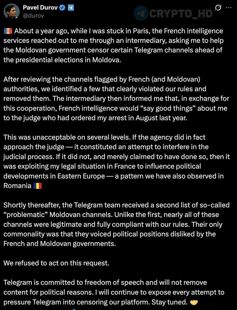 #ton 🇫🇷🇲🇩 Павел Дуров рассказал, что год назад французские спецслужбы обратились к нему с просьбой помочь правительству Молдовы цензурировать Telegram-каналы перед президентскими выборами. Взамен французская разведка обещала «замолвить словечко» перед судьей, который санкционировал арест Дурова. Создатель Telegram отметил, что похожая схема применялась и в отношении выборов в Румынии. «Вау» – так отреагировал на новость Илон Маск. Crypto Headlines