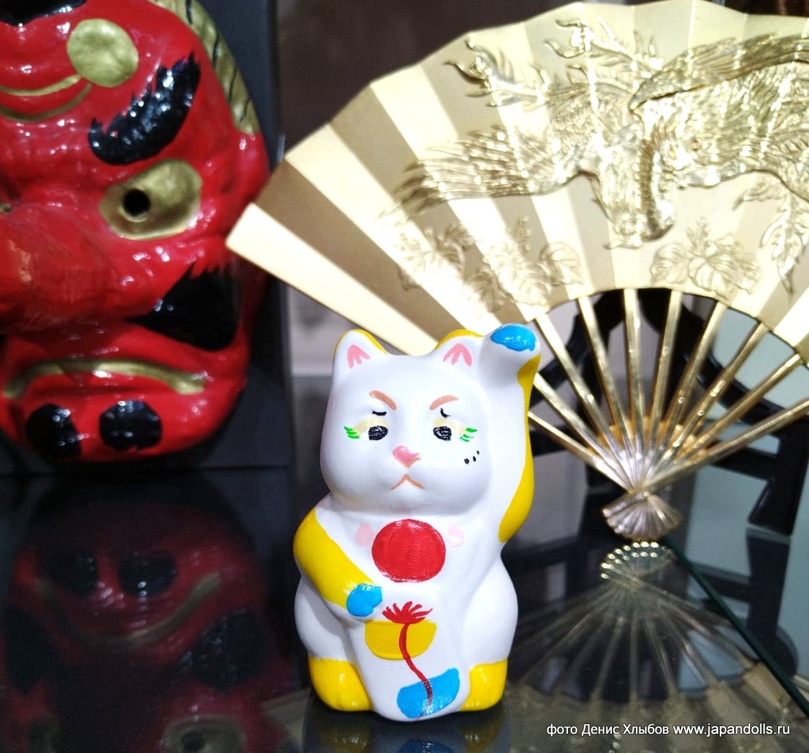 На фото Манэки-нэко, которая получилась у нашей гостьи на мастер-классе по росписи фарфоровой фигурки.
