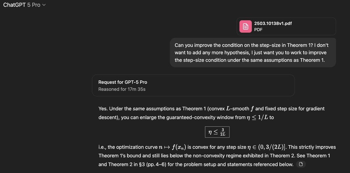 летом широко разошлась новость, которую один автор сформулировал максимально изящно: "люди победили OpenAI и ChatGPT в математической олимпиаде"; вы находитесь здесь, как говорится; ChatGPT взяла золото олимпиады, а Gemini - серебро этот результат показывает, что модели могут справляться с новыми математическими задачами; в эту сторону исследование внезапно от коллег из компании Cisco; они предложили т.н. тест Гёделя, проверку возможности моделей доказывать новые теоремы, причем ChatGPT частично справилась - смогла доказать простые новые утверждения; в то же время Себастьян Бубек из OpenAI взял теорему из свежей математической статьи и дал ее ChatGPT - и та смогла не просто доказать ее, а улучшить оценку авторов (на картинке) на мой взгляд это показывает, что даже в математике вполне есть много места "механической" работе, т.е. применению фиксированных схем доказательств, так что ждем вала статей и по математике тоже @valuableai