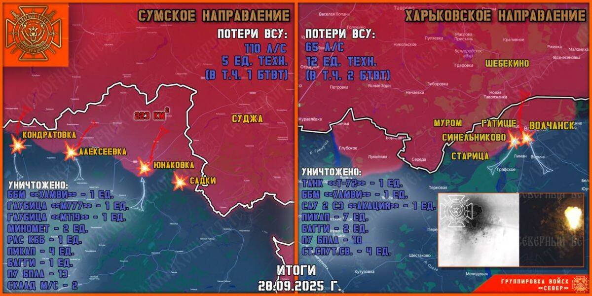 К утру 29 сентября появились новые подробности о формировании полосы безопасности в Харьковской и Сумской областях, в том числе и у границ с Курской областью. Северяне продолжают наступление в районе Юнаковки. ВСУ безуспешно пытаются контратаковать. Воины Севера продвинулись и закрепились в лесных массивах в районе Кондратовки. В составе штурмовых групп ВСУ замечен личный состав стрелковых подразделений воздушных сил Украины. Среди убитых штурмовиков найдены документы военнослужащих сводной стрелковой бригады ВВС Украины, рассказали в тг-канале «Северный ветер». На Теткинском и Глушковском участках фронта без существенных изменений. Артиллерия и БРЛА наносили удары по выявленным целям.
