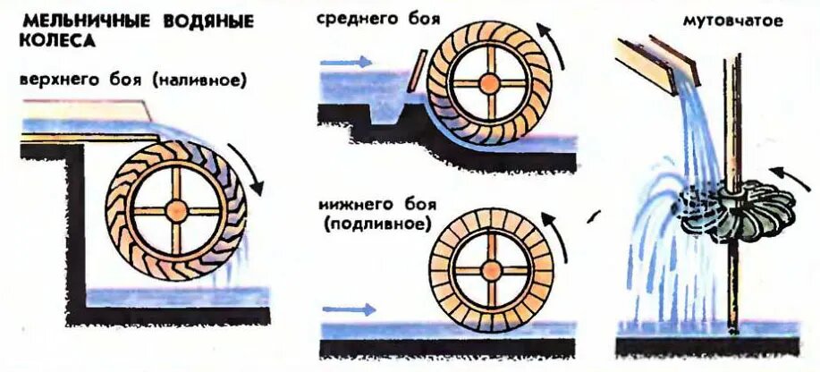 Так появились сначала нижнебойное колесо, как самое минимально эффективное, затем среднебойное, а потом и верхнебойное. Плюс всякие вариации на тему.