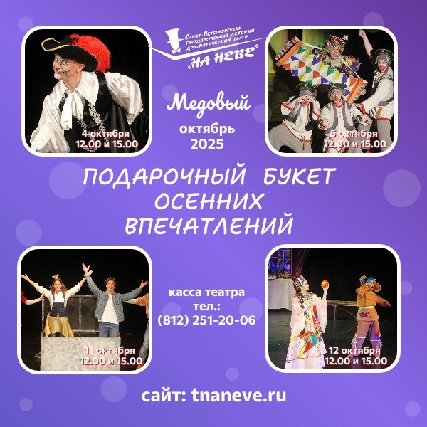 Наступает осенняя прохлада и вместе с ней приходит пора особого очарования – медовый октябрь! Мы приготовили для вас чудесные спектакли, которые согреют душу и подарят яркие эмоции. Приглашаем вас окунуться в мир сказки и насладиться очередной порцией медовых впечатлений! Не упустите возможность почувствовать себя частью волшебной осени в Театре "На Неве"! Приходите всей семьей! 4 октября в 12.00 и 15.00 - ПРИКЛЮЧЕНИЯ КОТА В САПОГАХ 5 октября в 12.00 и 15.00 - ГУСИ-ЛЕБЕДИ И БАБА-ЯГА 12 октября в 12.00 и 15.00 - БРЕМЕНСКИЕ МУЗЫКАНТЫ 13 октября в 12.00 и 15.00 - СКАЗКА О ПРЕКРАСНОЙ ЦАРЕВНЕ И О СЕМИ БОГАТЫРЯХ #театр_на_неве #театрнаневе #детскийтеатрспб #сказкананеве #юбилейКотавсапогах #медовыйоктябрь