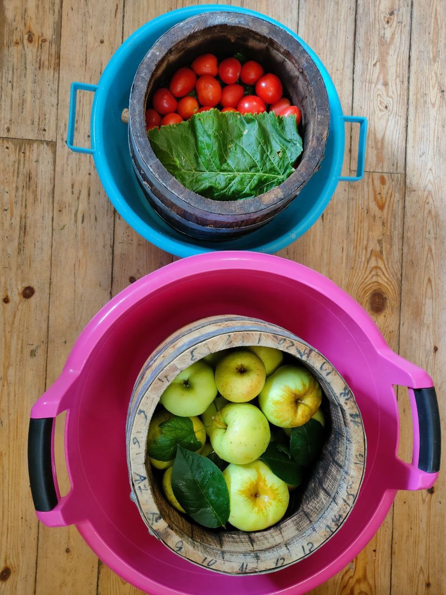 Избыток бочкотары в хозяйстве толкает на отважные эксперименты. Решили замутить бочковых помидоров и мочёных яблок. При отсутствии нормального погреба идея, возможно, дурацкая, но когда это нас останавливало? На той неделе еще капузды прикупим и ее заквасим. Алкоголя в доме хоть топись, а закуска как же?