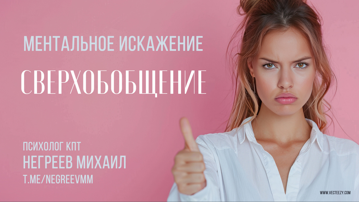 Сверхобобщение — это искажение интерпретации, при котором человек делает общий вывод на основе одного или нескольких изолированных инцидентов. Если что-то один раз произошло (или не произошло), человек начинает считать, что так будет всегда и во всех ситуациях.