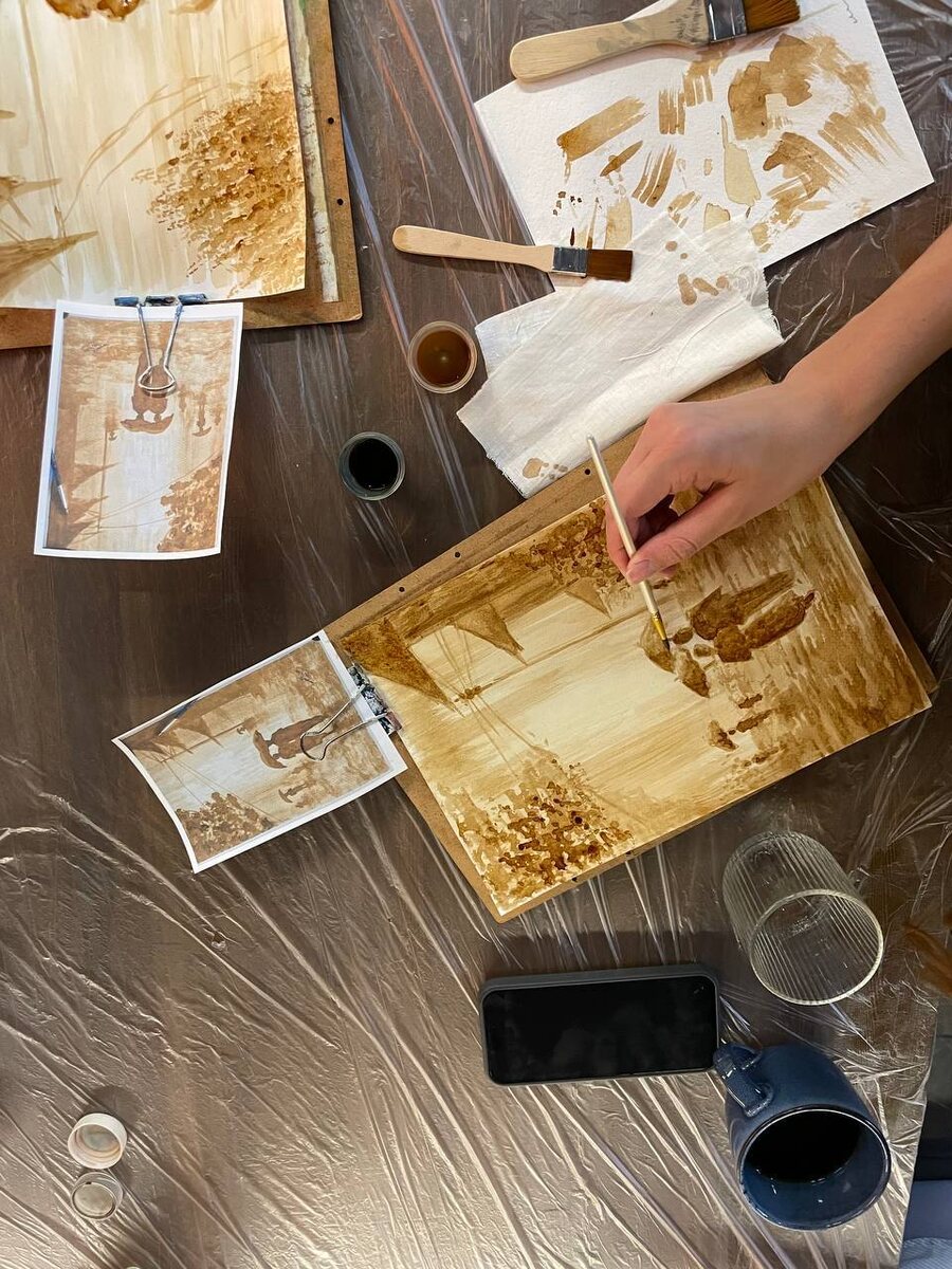 Представьте: вместо акварели - свежесваренный эспрессо, вместо кисти - старая добрая губка. Кофе дает потрясающую палитру оттенков: от нежного карамельного до глубокого шоколадного. Идеально для создания винтажных иллюстраций, портретов и пейзажей. Бонус: ваша картина будет источать бодрящий аромат еще несколько недель! 2. Вино: когда художник отдыхает