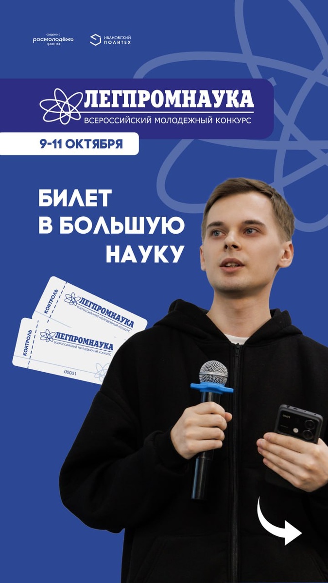 🥱 Если тебе скучно и трудно учиться в вузе – листай дальше. Но если ты стремишься развиваться, с интересом замечаешь, как технологии внедряются в нашу жизнь, и пробуешь себя в роли исследователя, аналитика, дизайнера или лектора – Всероссийский молодежный конкурс ЛЕГПРОМНАУКА ждёт тебя! 🗓 Финал с 9 по 11 октября в г. Иванове 👉 Программа и регистрация (до 01 октября) – на САЙТЕ Конкурс «ЛЕГПРОМНАУКА» проводится в рамках комплексной Программы развития социального потенциала молодежи «Живи в Иванове, учись в Политехе» при грантовой поддержке Федерального агентства по делам молодёжи — Росмолодёжь. #РосмолодёжьГранты #Росмолодёжь #Легпромнаука #ЖививИванове_УчисьвПолитехе