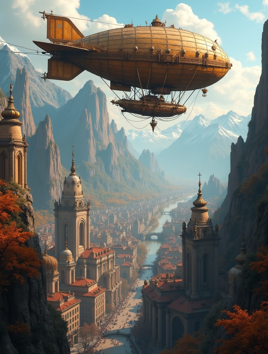 Плавно парящий в бодрящем сентябрьском утреннем воздухе дирижабль в стиле стимпанк открывает захватывающий вид на оживленный город, раскинувшийся среди величественных гор. Город внизу - это чудо замысловатых орнаментов и узоров, создающих ощущение предельного уюта. Светильники в викторианском стиле придают элегантности динамичному движению жителей города. Эта яркая сцена, напоминающая картину, передает красоту и замысловатость потрясающего мегаполиса в стиле стимпанк с непревзойденной детализацией и качеством исполнения.
