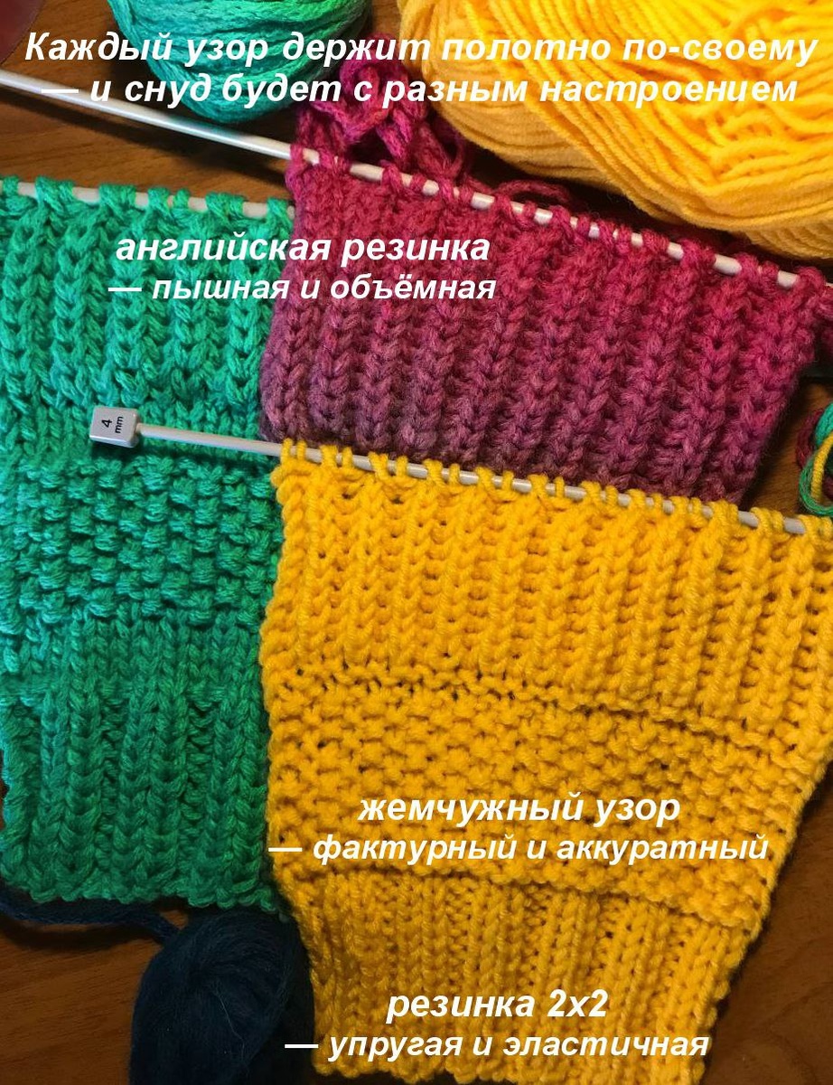 Ну что, свяжем уютный снуд? Вязание разнообразит ненастные долгие вечера не только тебе, но и всей семье. Представляю удивление близких от твоего нового образа рукодельницы 😊 Короче, ажиотаж неизбежен — даже немного завидую 😉 Итак... пряжа Для начала определимся с материалом (и да, магазины пряжи осенью — это отдельный изыск удовольствия): Толщина — бери среднюю (100 г ≈ 200–250 м). Однотонная пряжа — всегда выигрышный вариант: лаконично и стильно. Секционная пряжа — даёт полосы и плавные переходы, каждый моток уникален. Меланжевая пряжа — спокойные переливы без резких смен, полотно выглядит равномерно и мягко. Спицы... куда уж без них Круговые, на леске 40–60 см. Номер выбирай по этикетке пряжи — ориентируйся на середину диапазона. Узор... глаза разбегаются — можно неделю рассматривать варианты! Но для первого снуда остановимся на простых: они универсальны, легко запоминаются и выглядят элегантно: Классическая резинка 1х1 или 2х2. Фактурный жемчужный узор. Пышная и объёмн