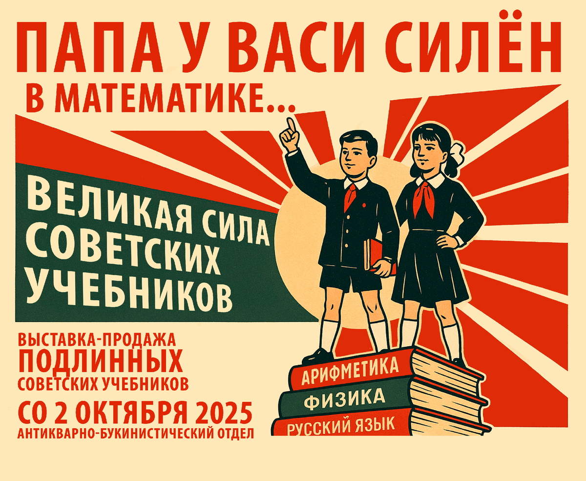 В интернете есть уйма статей, где сравнивают современные учебники с советскими, на форумах спорят о качестве нового образования и старого, советского. Кто-то из родителей даже охотится за старыми учебниками для своих детей! Правда, иногда охотиться совсем необязательно… С 2 октября в книжном магазине «Москва» в Антикварно-букинистическом отделе пройдет выставка-продажа подлинных советских учебников «Старый добрый советский учебник». Учебники, от букварей младшей школы до университетских пособий, были бесплатными и доступными для каждого. От Мурманска до Владивостока на партах лежали одинаковые учебники, а школьная система была единой для всех. Многие уверены, что благодаря такому подходу советский человек первым полетел в космос, первым запустил спутник на орбиту Земли и много еще чего сделал первым. А папа у Васи был силен в математике! Можно ли за это благодарить советские учебники? Еще как! Многие современные школы учатся по тем же учебникам тех же самых авторов, что и пятьдесят, а