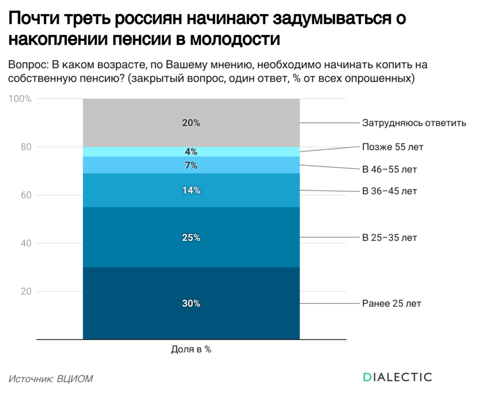 Несмотря на это, в обществе сохраняется значительный скептицизм относительно будущей жизни на пенсии. На вопрос о дополнительных источниках дохода, кроме государственной пенсии, после наступления пенсионного возраста, 35% респондентов ответили, что у них «нет возможности накопить» сбережения. 16% рассчитывают «только на себя», 9% планируют жить на государственное пособие, еще 9% ссылаются на то, что «здоровье не позволит работать дальше», 5% выразили опасение, что «не доживут до пенсии», а 4% полагают, что пенсии в будущем будут отменены.