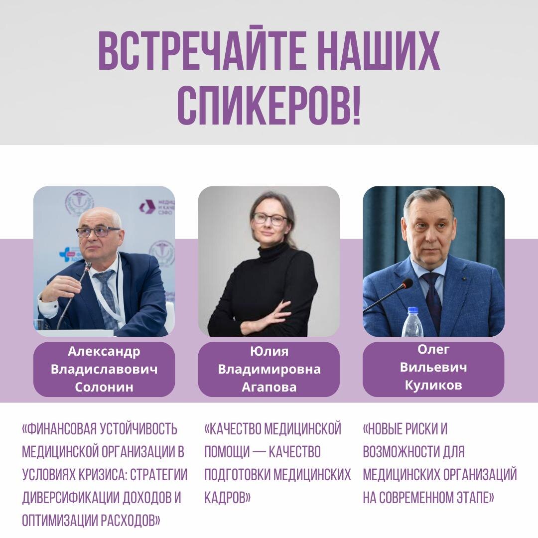 Лица события. Наши спикеры! Ч.2 🗣🔈 📅 16 октября 2025 года — второй день VIII Конференции «Медицина и качество». Вас ждут яркие спикеры и практические инструменты для руководителей, врачей и менеджеров здравоохранения. 👤 Александр Владиславович Солонин Генеральный директор СРО «Ассоциация частных клиник Санкт-Петербурга», заведующий кафедрой современных технологий управления здравоохранением ЧОУ ДПО «АМО им. Ф. И. Иноземцева». Доклад: «Финансовая устойчивость медицинской организации в условиях кризиса: стратегии диверсификации доходов и оптимизации расходов» Вы узнаете о практических инструментах финансового планирования, которые помогут сохранить стабильность даже в периоды экономических потрясений. 👤 Юлия Владимировна Агапова Заведующий кафедрой медико-социальных проблем охраны материнства и детства ЧОУ ДПО «АМО им. Ф. И. Иноземцева», директор по профразвитию Ассоциации медицинских сестёр России, член профильной комиссии Минздрава РФ. Доклад: «Качество медицинской помощи