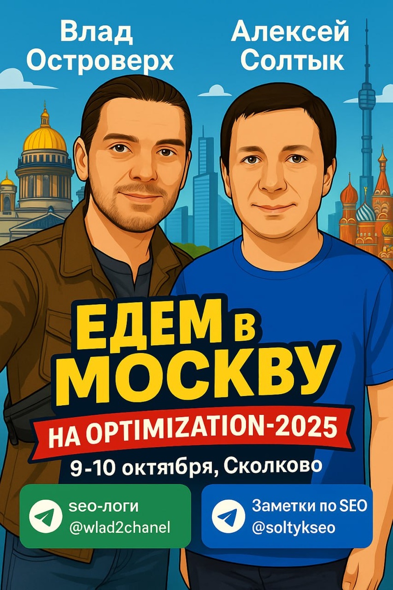 🚄 Еду в Москву на Optimization-2025! 9–10 октября буду в Сколково вместе с Владом Островерхом (@wlad2). Если будете на конференции — давайте познакомимся, пообщаемся про SEO, автоматику и мой софт SEO Semantic Lab. Пишите в личку — договоримся встретиться на кофе и нетворкинге. 📌 Когда: 9–10 октября (чт–пт) 📌 Где: МШУ Сколково, ул. Новая, 100 📌 О чём: AEO/GEO, техничка, автоматизация, реальные кейсы, будущее поиска. Наши каналы: 🔹 Влад: SEO-логи @wlad2chanel — кейсы, лайфхаки, практика. 🔹 Мой: Заметки по SEO Soltyk.ru — семантика, инструменты, разборы. Как встретиться: — Напишите мне в ЛС @seosoltyk или Владу @wlad2. — Мы будем на площадке весь день 9-го и до вечера 10-го. — Могу рассказать про SEO Semantic Lab и обсудить вашу семантику или стратегию. P.S. Еду из Питера поездом. Если кто тоже «сапсанит» — можем пересечься в дороге ☕️