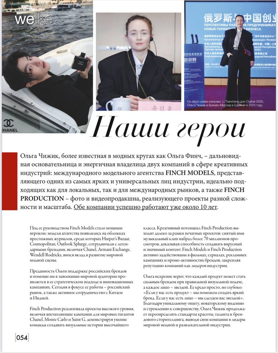 Представляем вашему внимаю публикации с нашим директором Ольгой Финч (Чижик) в этом году 🫶🏼 1. Как строится мода будущего: беседа с Ольгой Чижик о моделях, креативных индустриях и международном сотрудничестве от 21.06.2025 https://eandes.ru/tpost/n6xlhfc9c1-kak-stroitsya-moda-buduschego-beseda-s-o 2. «Любовь к судьбе» - полная статья об Ольге Чижик (Ольге Финч) и о ее двух бизнесах (август 2025): https://citystyle.life/давай-поговорим-давай-поговорим/ольга-чижик/ И во вложении к этому посту - вы можете ознакомиться с печатной публикацией в журнале Dress Code «Ольга Чижик и ее 2 бизнеса в креативных индустриях: модельное агентство Finch Models и фото, видео компания Finch Production» (сентябрь 2025) Желаем вам приятного знакомства с нашим очаровательным директором 🕊️