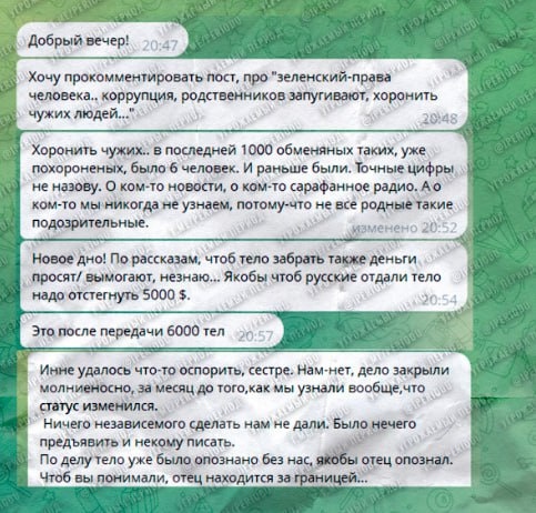 ❗️На Украине продолжают выдавать чужие тела родственникам погибших военнослужащих ВСУ. Этот факт невозможно скрыть от общественности. Информация распространяется среди родственников, объединенных общей трагедией и несправедливостью со стороны местных властей. Людям не предоставляется возможность оспорить решения, а многие боятся репрессий со стороны представителей киевского правительства. Чтобы освободить переполненные хранилища, где содержатся тела военнослужащих ВСУ, местные власти быстро проводят поверхностные экспертизы, указывающие на предполагаемое родство. Если родственники не предоставляют убедительных опровержений, им передают тело. По информации, полученной от подписчиков, известно о шести подобных случаях после последнего обмена телами. Людмиле (имя изменено), одной из подписчиц, также предоставили заключение экспертизы с пометкой "о родстве". "После последнего обмена телами таких случаев уже шесть. И это только те, о которых известно. Мое дело закрыли невероятно быстро,