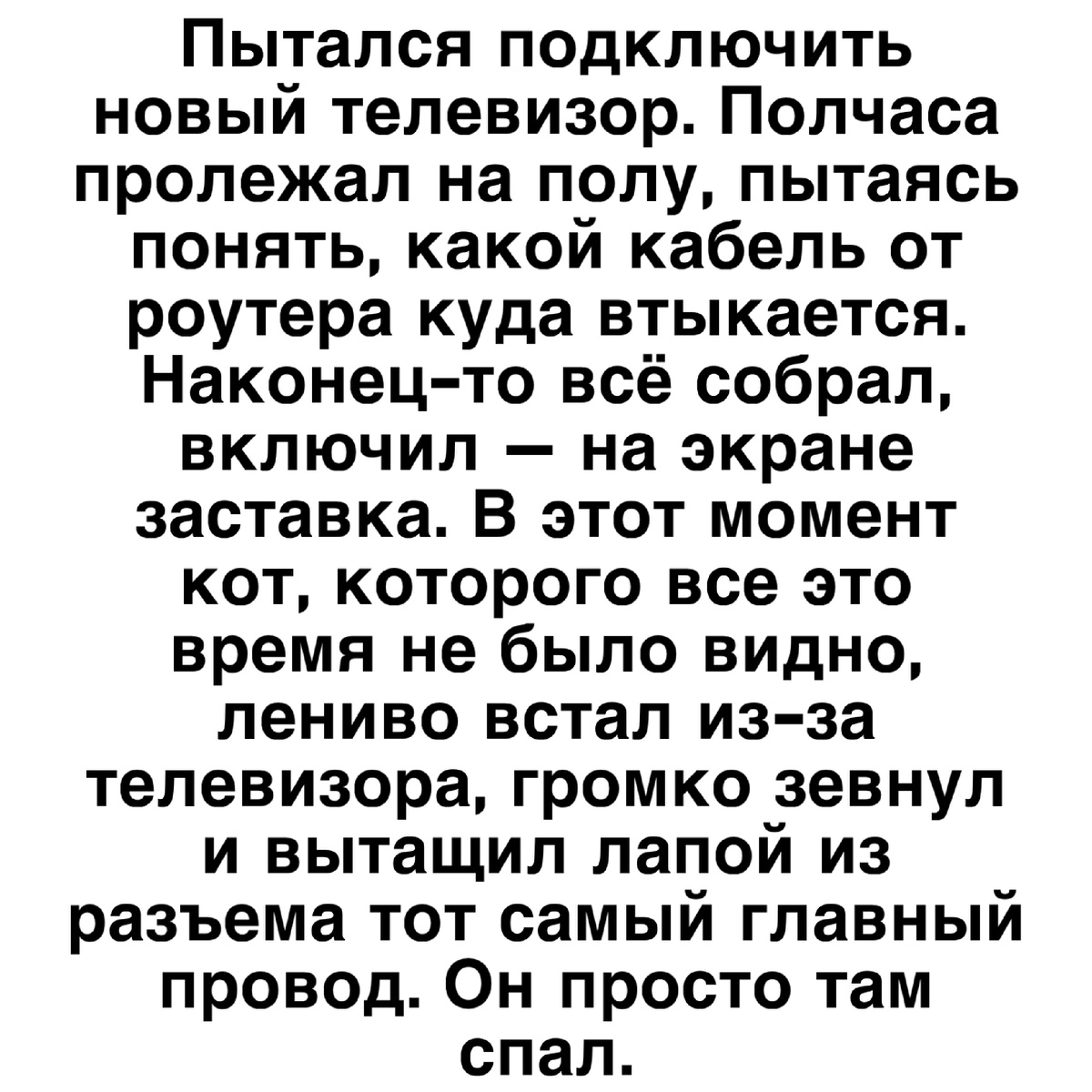Пытался подключить новый телевизор. Полчаса пролежал на полу, пытаясь понять, какой кабель от роутера куда втыкается. Наконец-то всё собрал, включил — на экране заставка. В этот момент кот, которого все это время не было видно, лениво встал из-за телевизора, громко зевнул и вытащил лапой из разъема тот самый главный провод. Он просто там спал.