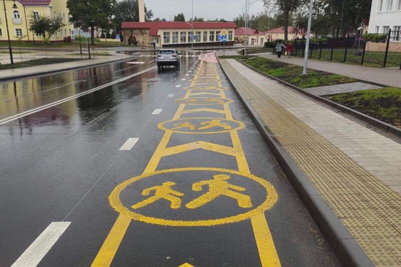 В Заславле на дорогах появилась необычная разметка — такой нет даже в столице. Об этом сообщает Белорусский дорожный инженерно-технический центр. Обновление дорожного покрытия и нанесение новой разметки приурочили к празднику тружеников села «Дожинки-2025». Для горизонтальной разметки специалисты использовали цветной холодный пластик, предварительно согласовав технологию нанесения. Абсолютно новой для нашей страны стала разметка зоны посадки-высадки детей (желтая) около школ и окантовка аппликаций красным холодным пластиком. В Минске появилась новая синяя разметка — для чего она? Эти элементы были впервые нанесены при помощи стимографа, простыми словами – дорожного принтера, который автоматически наносит разметку на асфальт. «Город получил не просто стандартную «зебру», а инновационное решение, которое является эстетичным, повышает видимость, способствует повышению безопасности дорожного движения», – рассказали в организации. На всех знаках, нанесенных стимографом, можно заметить не сп