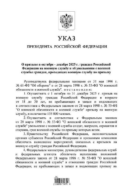Владимир Путин подписал указ о начале осеннего призывной кампании. Согласно документу, в российскую армию планируется призвать 135 тысяч граждан. Подписаться на Подмосковье сегодня