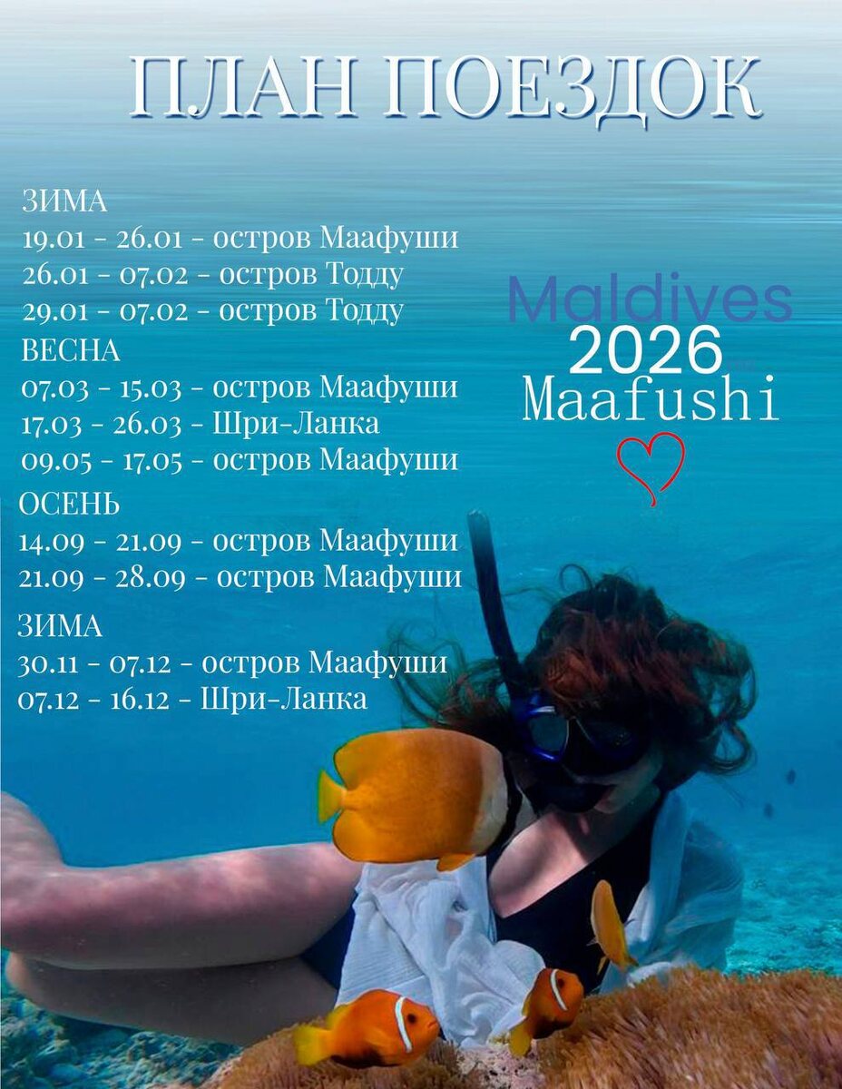 Друзья открыто бронирование на 2026 год по Мальдивам! На Шри-Ланку в декабре одно место освободилось! 10 ночей, экскурсионная программа, завтраки и сопровождение! Успейте занять место!💳 📆Даты туров и актуальное количество мест на 25 год: - 24.11 - 01.12 - 8 мест о.Маафуши - 7 ночей/8 дней, включено: проживание в гостевом доме, завтраки, лучшие экскурсии, тематические ужины, фото и видеосъемка под водой и с дрона, полное сопровождение, мастер класс по фридайвингу, снорклинг на домашнем рифе, погружение в культуру и быт местных жителей. - 01.12 - 10.12 - 1 место Шри-Ланка 990$⚡ 📆Даты туров и актуальное количество мест на 26 год: 19.01 - 26.01 - 990$ - 2 места о.Маафуши - 7 ночей/8 дней, включено: проживание в гостевом доме, завтраки, лучшие экскурсии, тематические ужины, фото и видеосъемка под водой и с дрона, полное сопровождение, мастер класс по фридайвингу, снорклинг на домашнем рифе, погружение в культуру и быт местных жителей. 26.01 - 29.01 после Маафуши можно поехать на