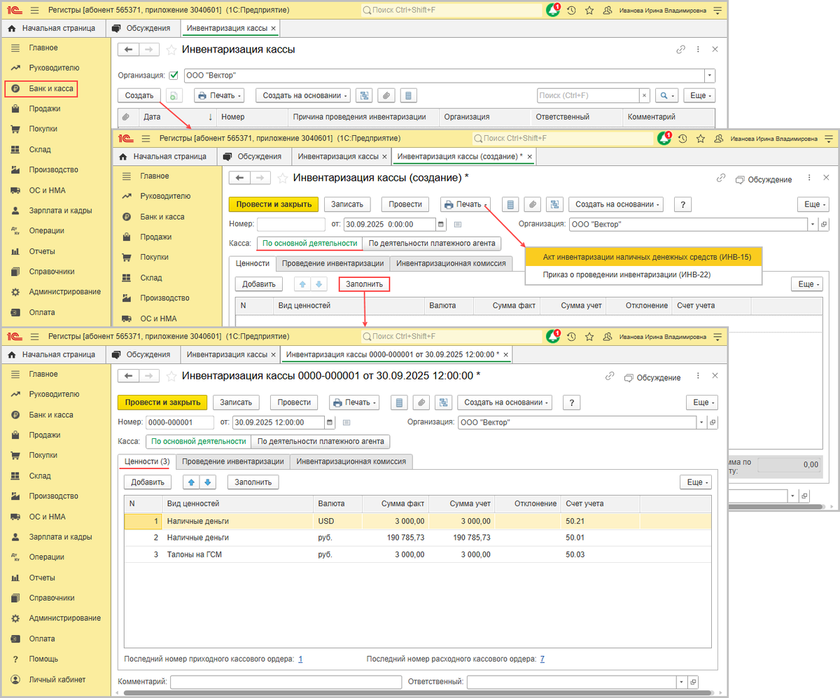 Для проведения инвентаризации кассы в программе используется документ "Инвентаризация кассы". 1. Раздел: Банк и касса – Инвентаризация кассы. 2. Кнопка "Создать" (рис. 1). 3. В поле "от" укажите дату проведения инвентаризации. 4. Установите переключатель "Касса" в положение "По основной деятельности", если проводится инвентаризация кассы по основной деятельности организации, или "По деятельности платежного агента", если проводится инвентаризация кассы платежного агента (выбранное значение выделяется шрифтом зеленого цвета). 5. На закладке "Ценности" (рис. 1): - заполните табличную часть документа по кнопке "Заполнить" (автоматически по учетным данным) или по кнопке "Добавить" (вручную); - при добавлении новых строк вручную: -- в колонке "Вид ценностей" выберите вид денежного актива ("наличные деньги" или "денежный документ" для основной деятельности либо только "наличные деньги" для деятельности налогового агента), затем для вида актива "денежный документ" выберите сам актив из справоч