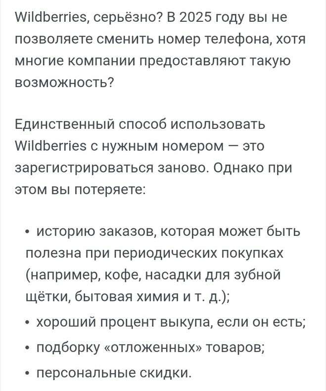 Это конечно не очень удобно, потому что ведет к потере всех данных и накопленных скидок.И, это очень неправильно.В различных Российских Банках Сбер, ВТБ, Альфа, Совкомбанк, и прочие в которых безопасность данных и сведений на порядок выше и надёжнее, чем в шарашкиной конторе общероссийской Барахолке по имени Валбейрис, можно сменить номер телефона, без потери данных. А, вот в Валбейрисе, обычном маркетплейсе, одним из многих, нельзя. Типа это они так радеют за нашу безопасность, и не вводят такой функционал. Ну бред, тупость, глупость, идиотизм чистой воды!!! Где банки, а где Валбейрис? Это несопоставимые величины, разные уровни. Надо долбить Валбейрис, закидать его жалобами, писать письма в Роспотребнадзор, чтобы они ввели возможность смены номера телефона в профиле в личном кабинете, без потери прогресса скидок, выкупа, персональных скидок, истории заказов, и так далее. Я считаю, что это неприемлемо. В любом сервисе, особенно в маркетплейсе, должна быть возможность смены привязанного номера телефона. Отсутствие такой функции — это неуважение к пользователям.
