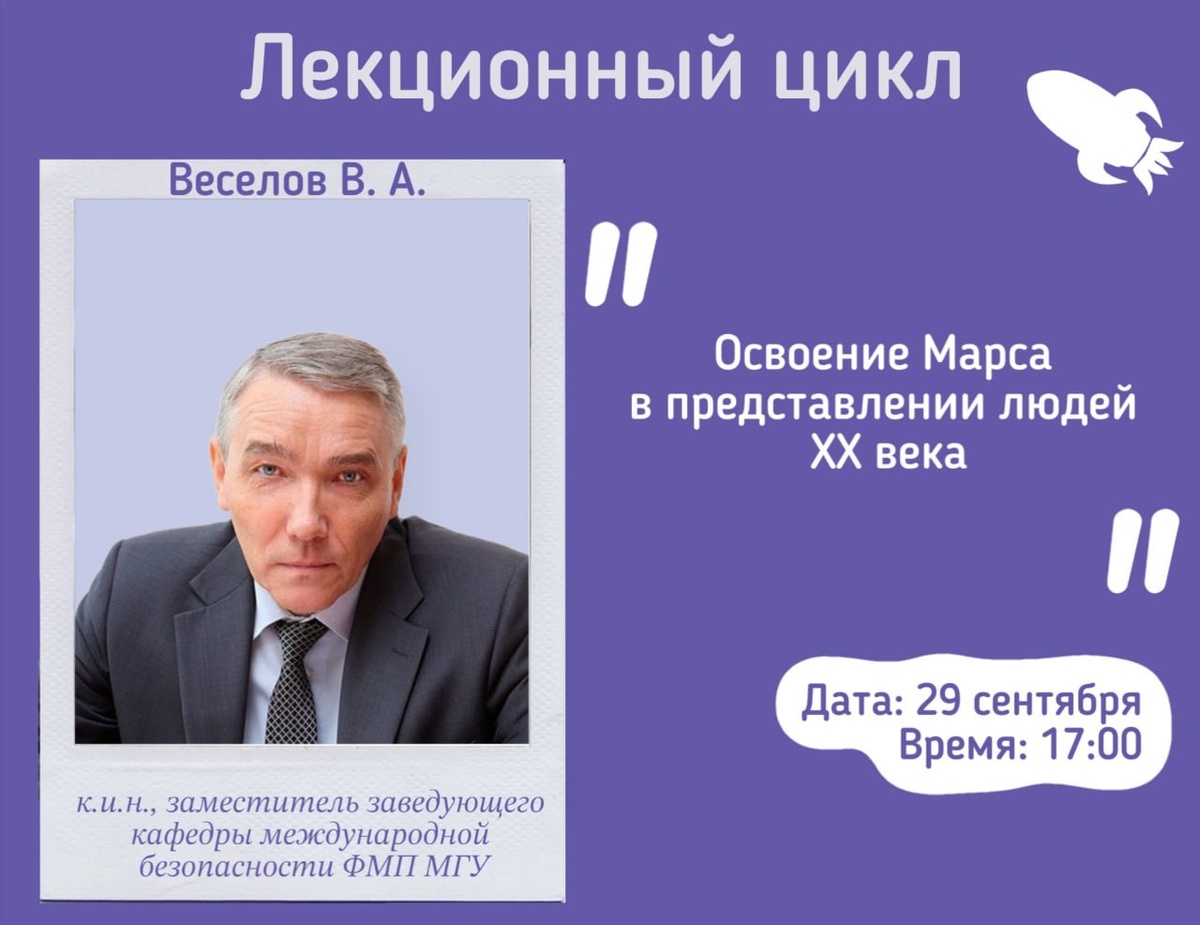Дорогие друзья! Уже сегодня стартует наш цикл лекций, посвященный Красной планете. 👉17:00 👉«Освоение Марса в представлении людей ХХ века» от Василия Александровича Веселова, к.и.н., заместителя заведующего кафедры международной безопасности ФМП МГУ. Оставляем открытой регистрацию на случай, если Вы не успели подать заявку в срок. 🟣 РЕГИСТРАЦИЯ НА ЦИКЛ ОТКРЫТЫХ ЛЕКЦИЙ Искренне Ваша, команда Космического проекта ФМП МГУ
